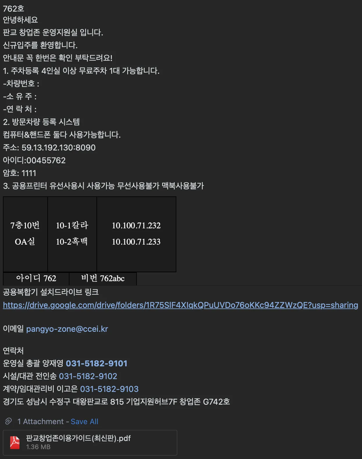 - 사무공간에 할단된 IP 수는 총 4개 입니다.(입주 당일에 안내)