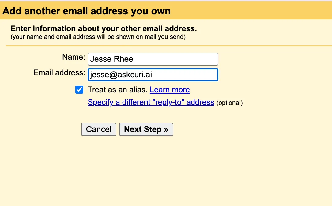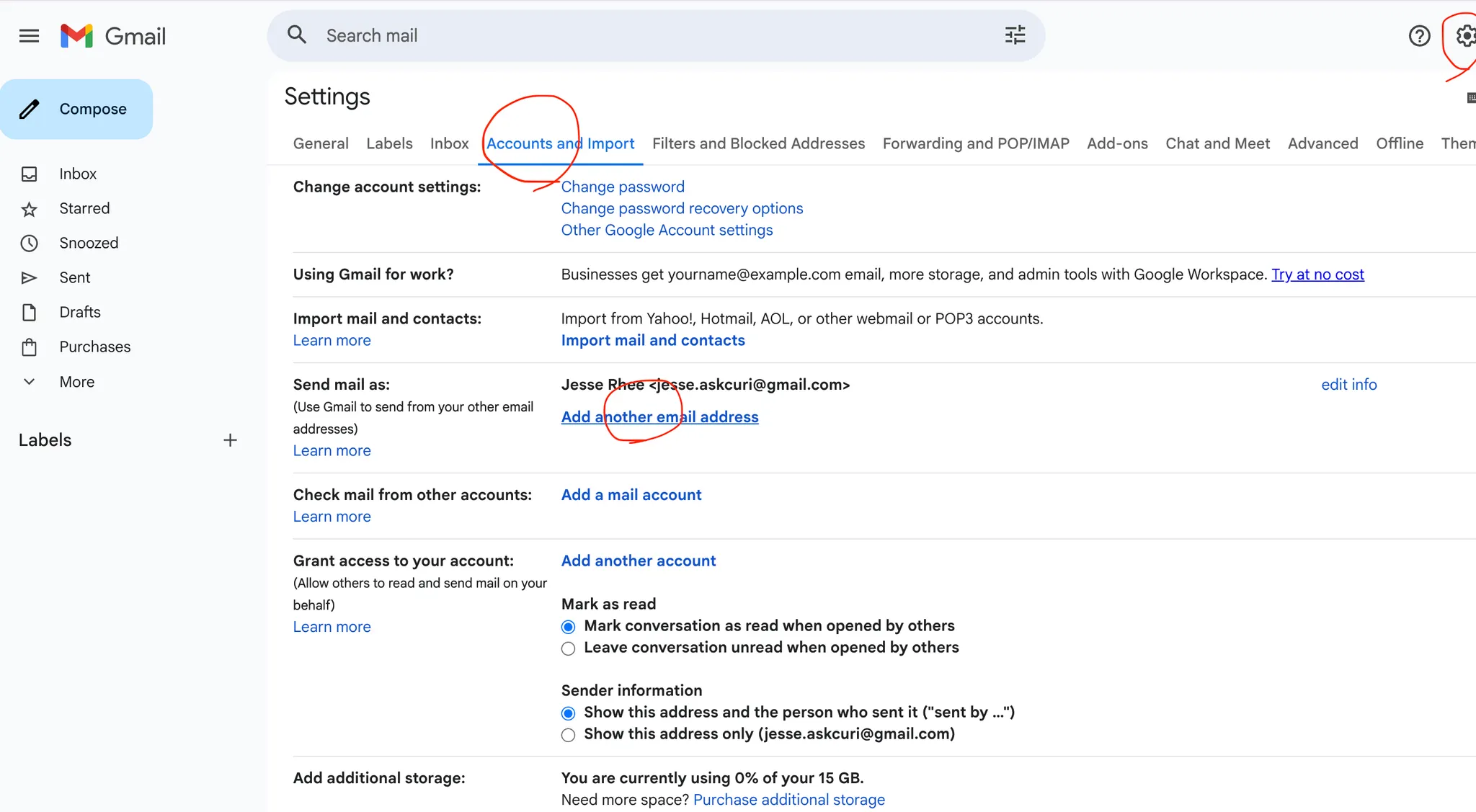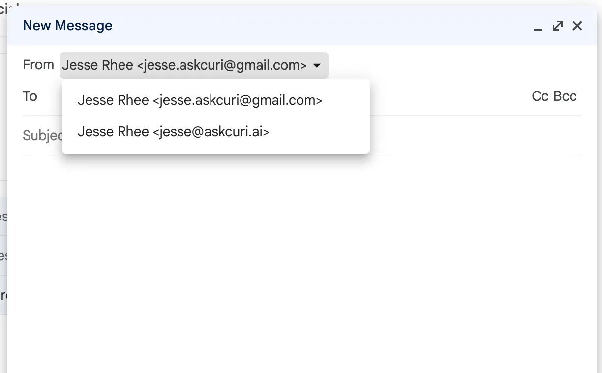 이제 gmail에서 메일 쓸때 From 에서 창을 내려보면 보내는 메일을 @askcuri.ai 로 보낼 수 있다. 이 메일로 보내는 걸 기본으로 하려면 설정에서 아래와 같이 설정한다.