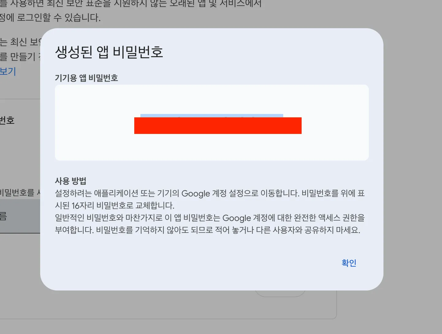 비번: [자신의 app password] 위에서 복사해 돈 것.