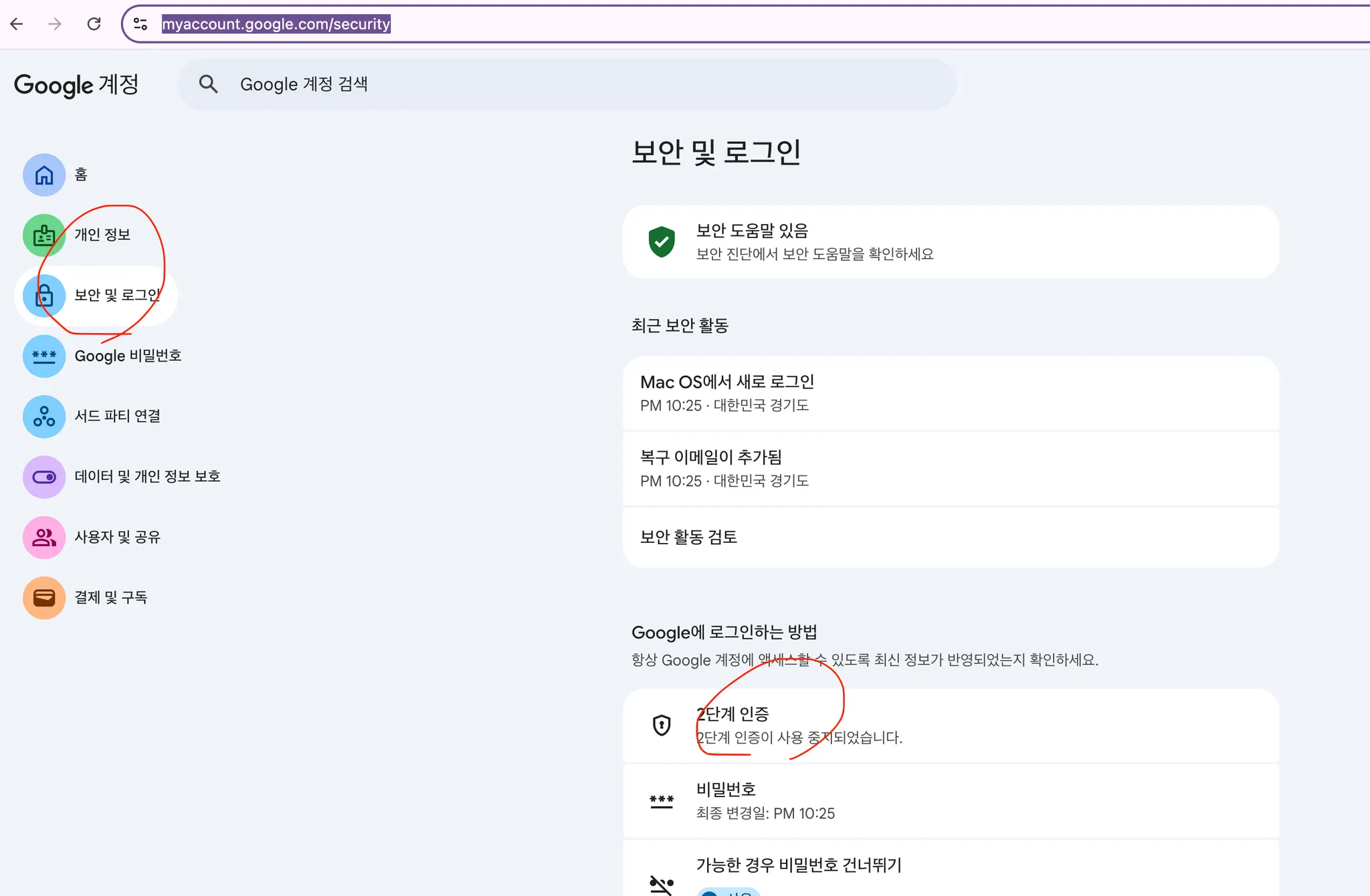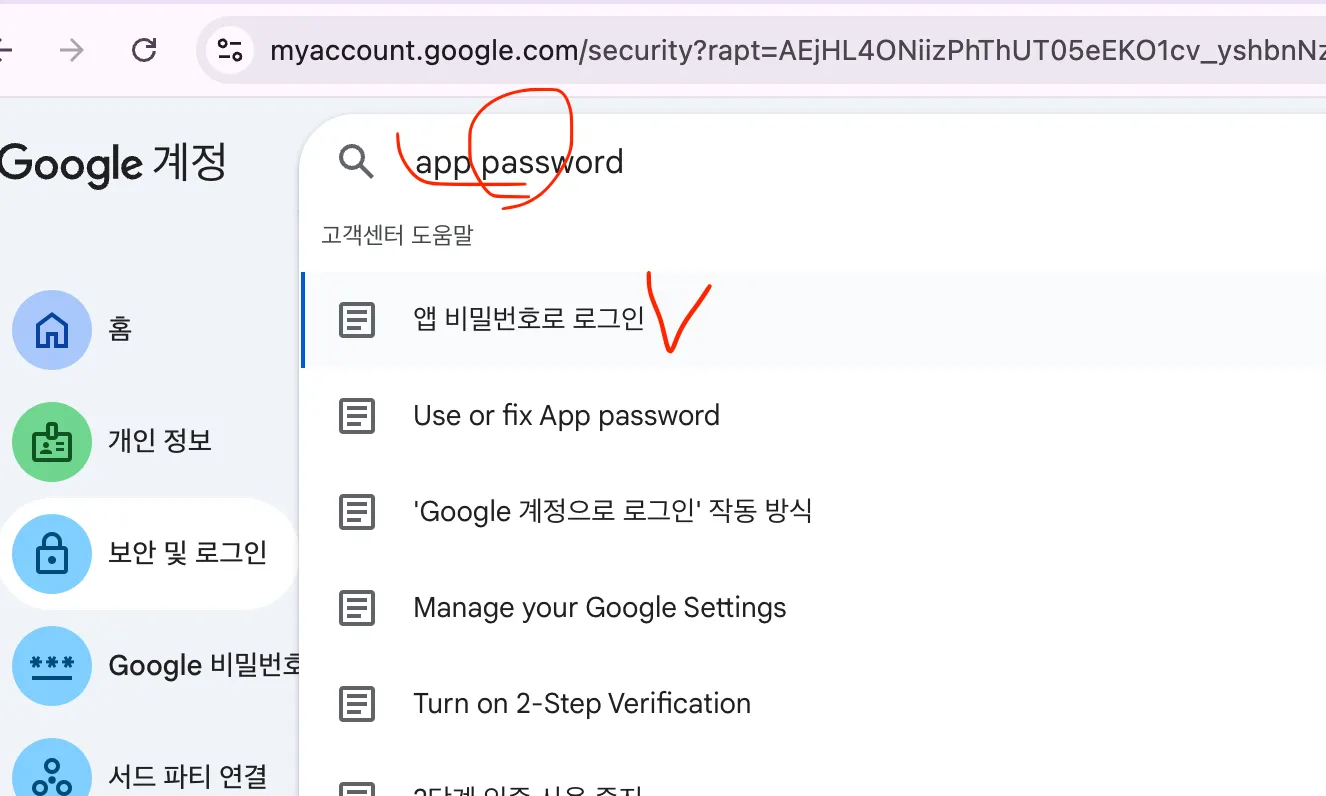 먼저 구글의 app password를 만들어야 한다. 그러기 위해서는 2단계 인증 먼저 켜야 한다.