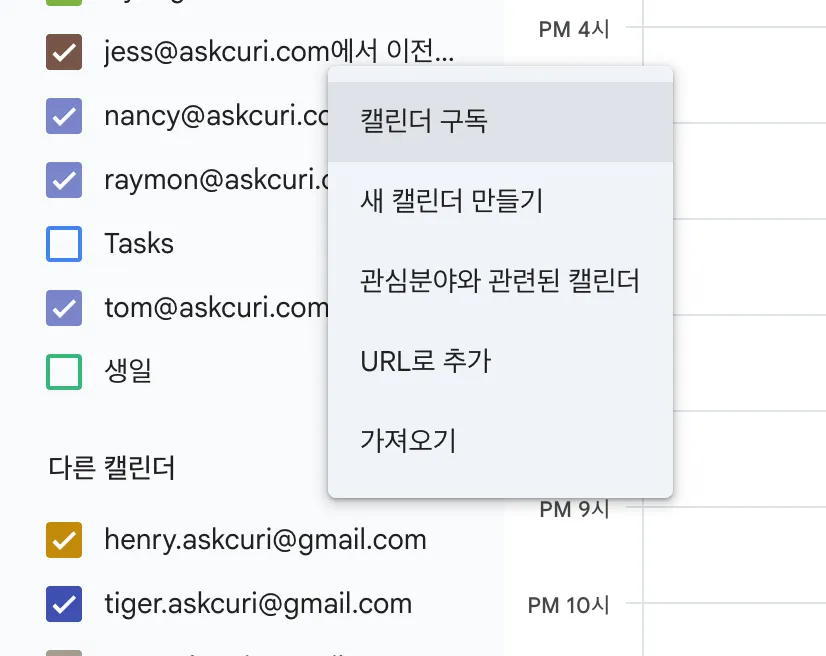 구글캘린더에 동료들 이메일 구독하고 본인의 이메일을 동료들에게 구독하게 안내해서 구글캘린더로 매일 업무 및 미팅 진척상황에 대해 서로 알수 있게 세팅하고 매일 업데이트 작성하기