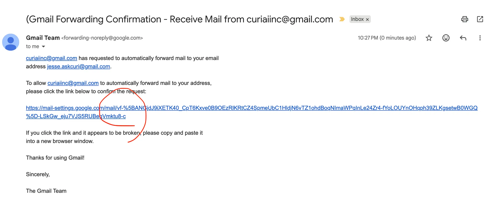회사에서 메일 포워딩 연결을 요청하면 다음과 같은 메일을 받게된다. 빨간 원의 링크를 클릭해 승인한다.