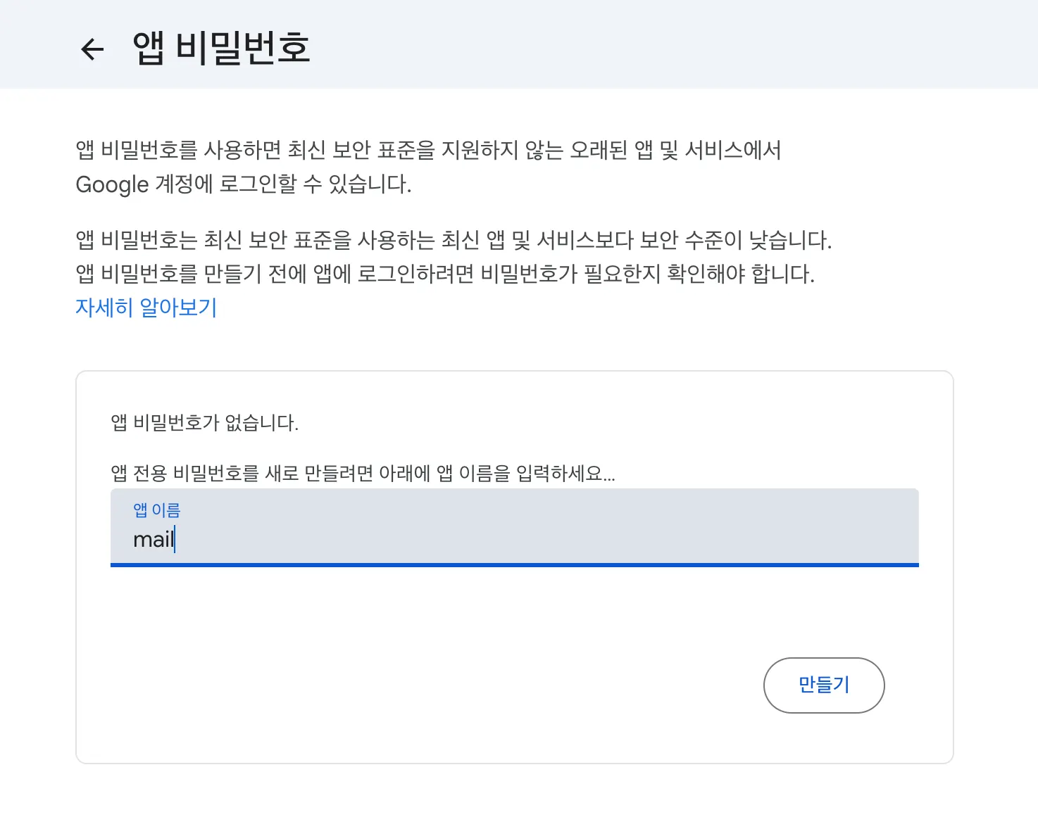 앱 이름은 자신이 기억할 수 있는걸로 임의로 정하고 비밀번호를 만들어 저장해 둔다.(이 내용이 아래 메일 설정에서 필요하다.)