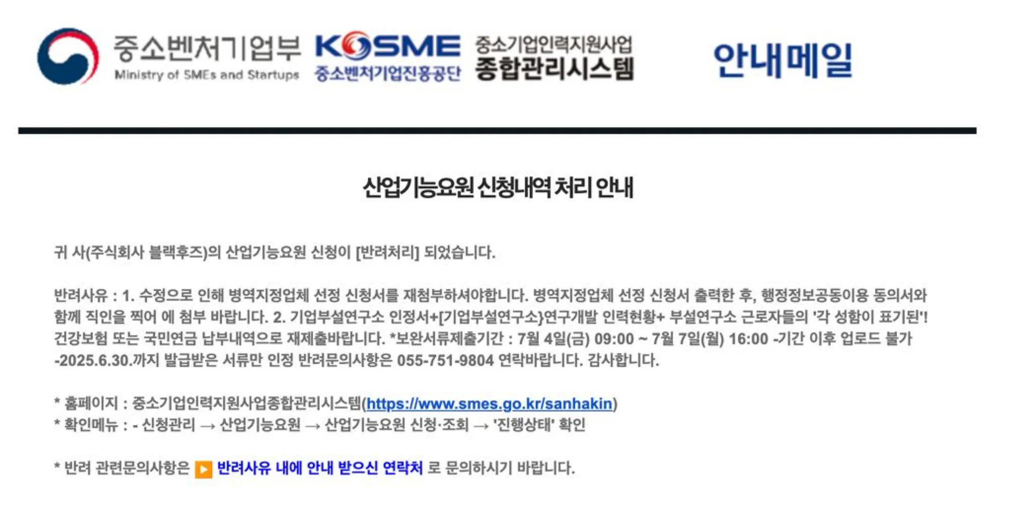 보완서류제출기간 : 7월 4일(금) 09:00 ~ 7월 7일(월) 16:00