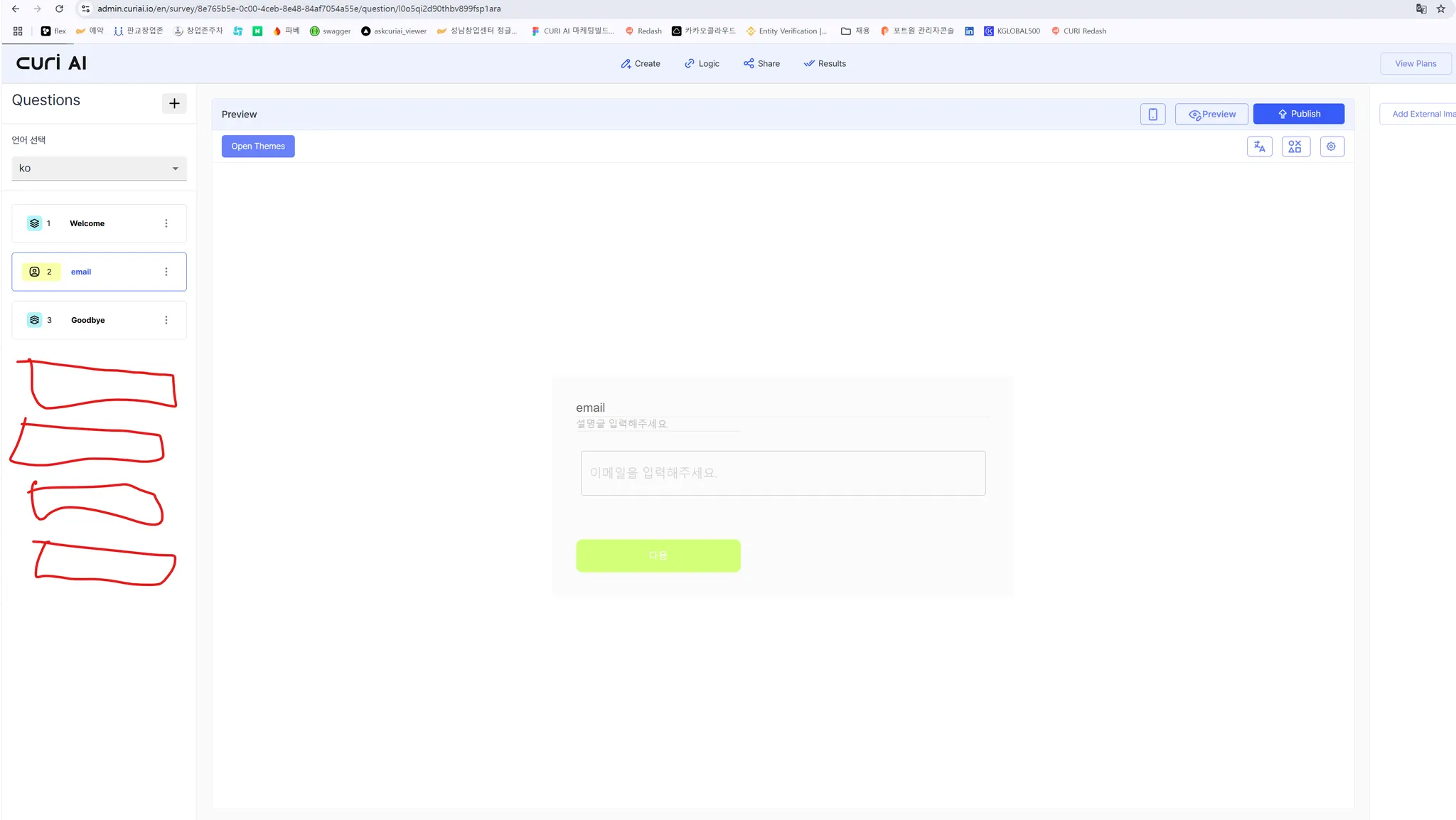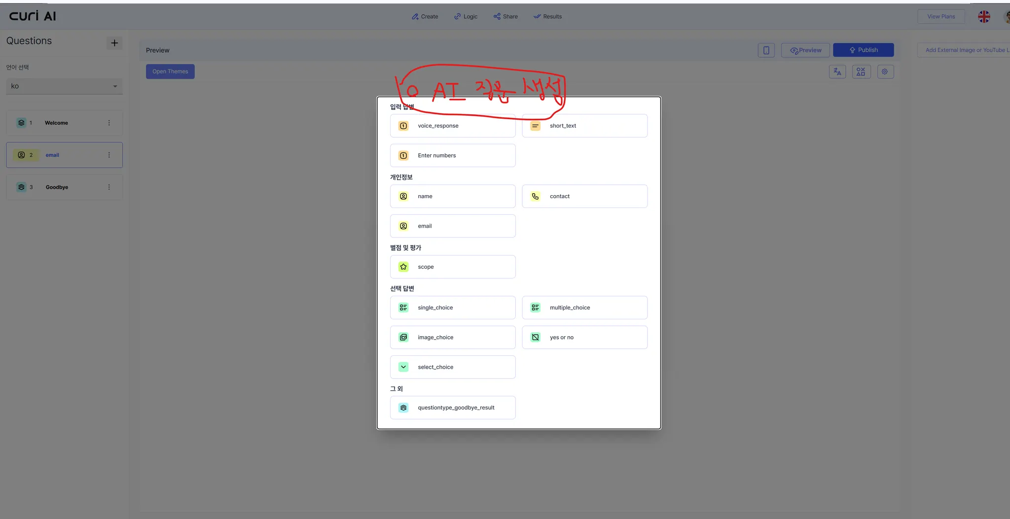 이를 바탕으로 현재 admin.curi.ai의 질문생성시 왼쪽 질문 리스트에 AI가 생성해준 후보 질문들 중 선택해서 한번에 추가하고 순서를 바꿀 수 있도록 해줌
