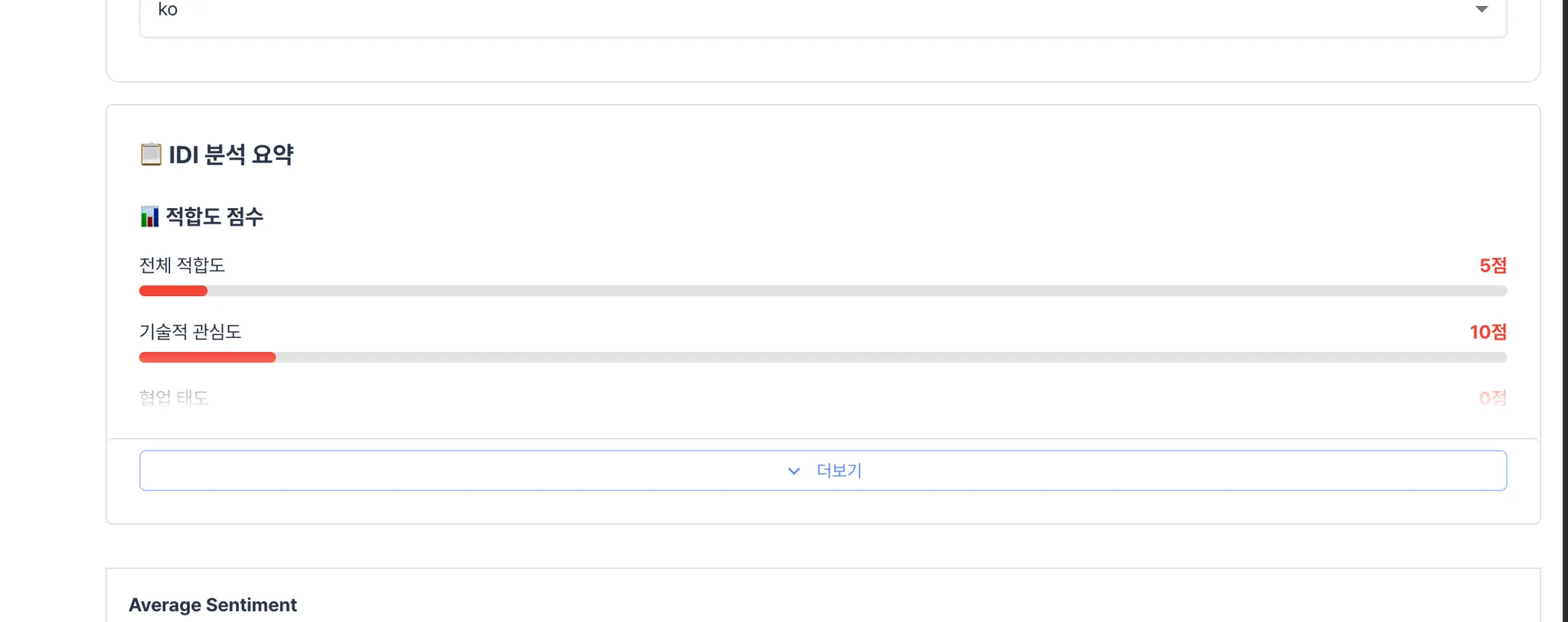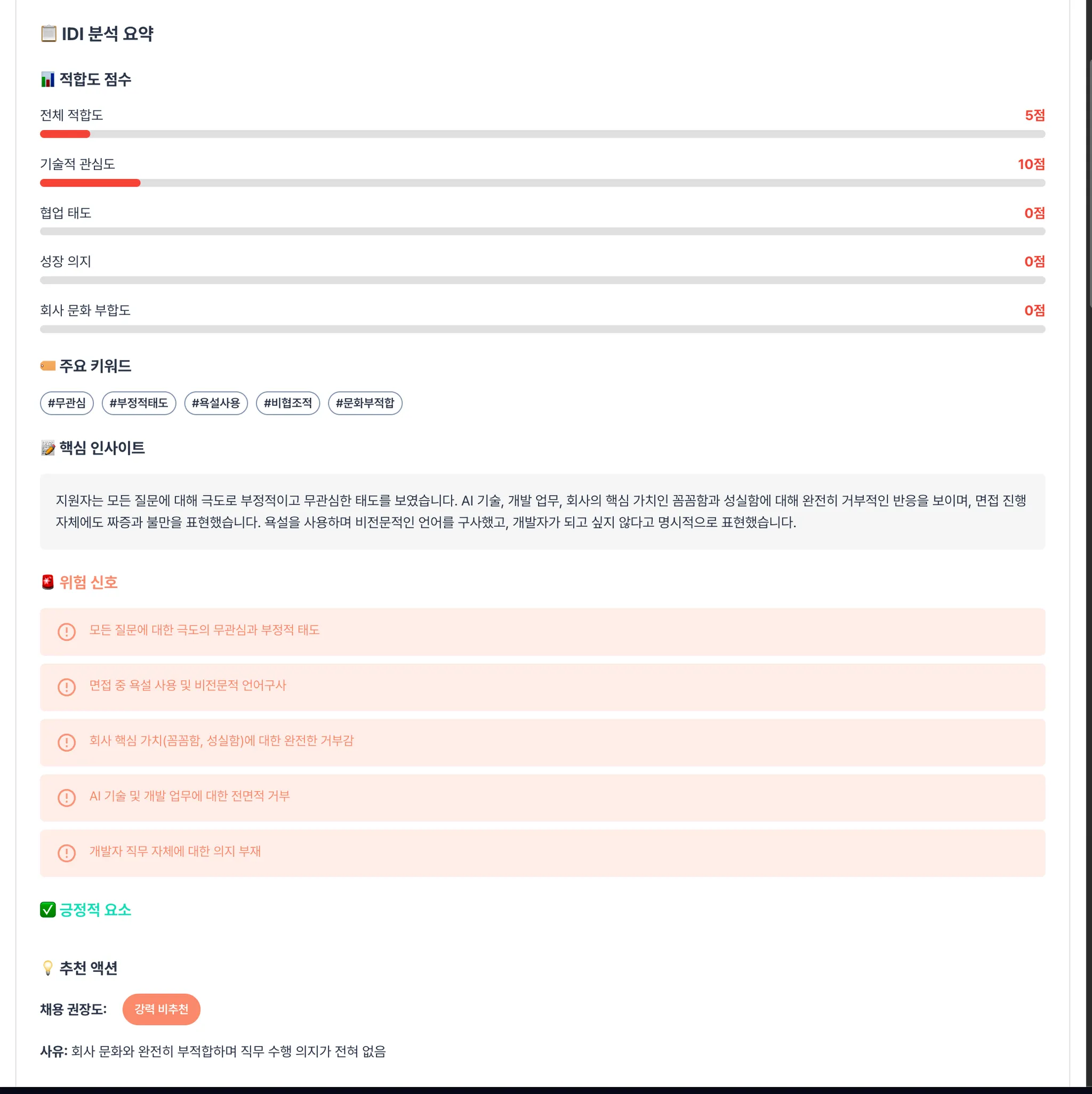 IDI Summary는 Individual Depth Interview(개별 심층 면접) 결과를 Claude AI를 활용하여 자동으로 분석하고 구조화된 요약을 제공하는 기능입니다. 채용 담당자가 면접 결과를 빠르고 정확하게 파악할 수 있도록 핵심 인사이트와 적합도 평가를 제공합니다.