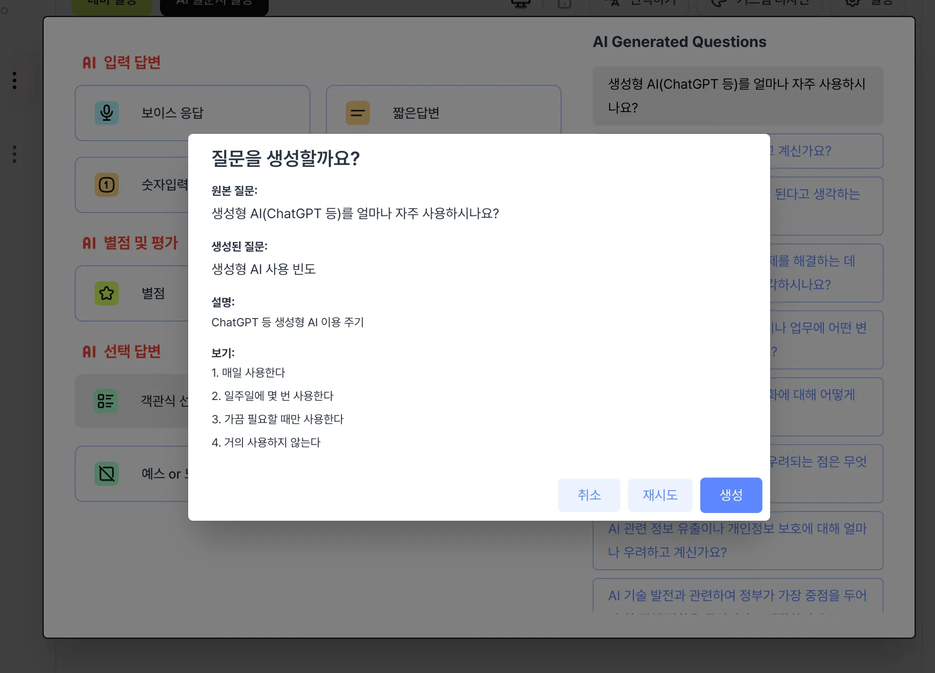 제안해준 제일 상단 질문과 왼쪽의 유형 중 객관식을 선택했을 경우는 객관식 보기까지 생성해 줍니다.