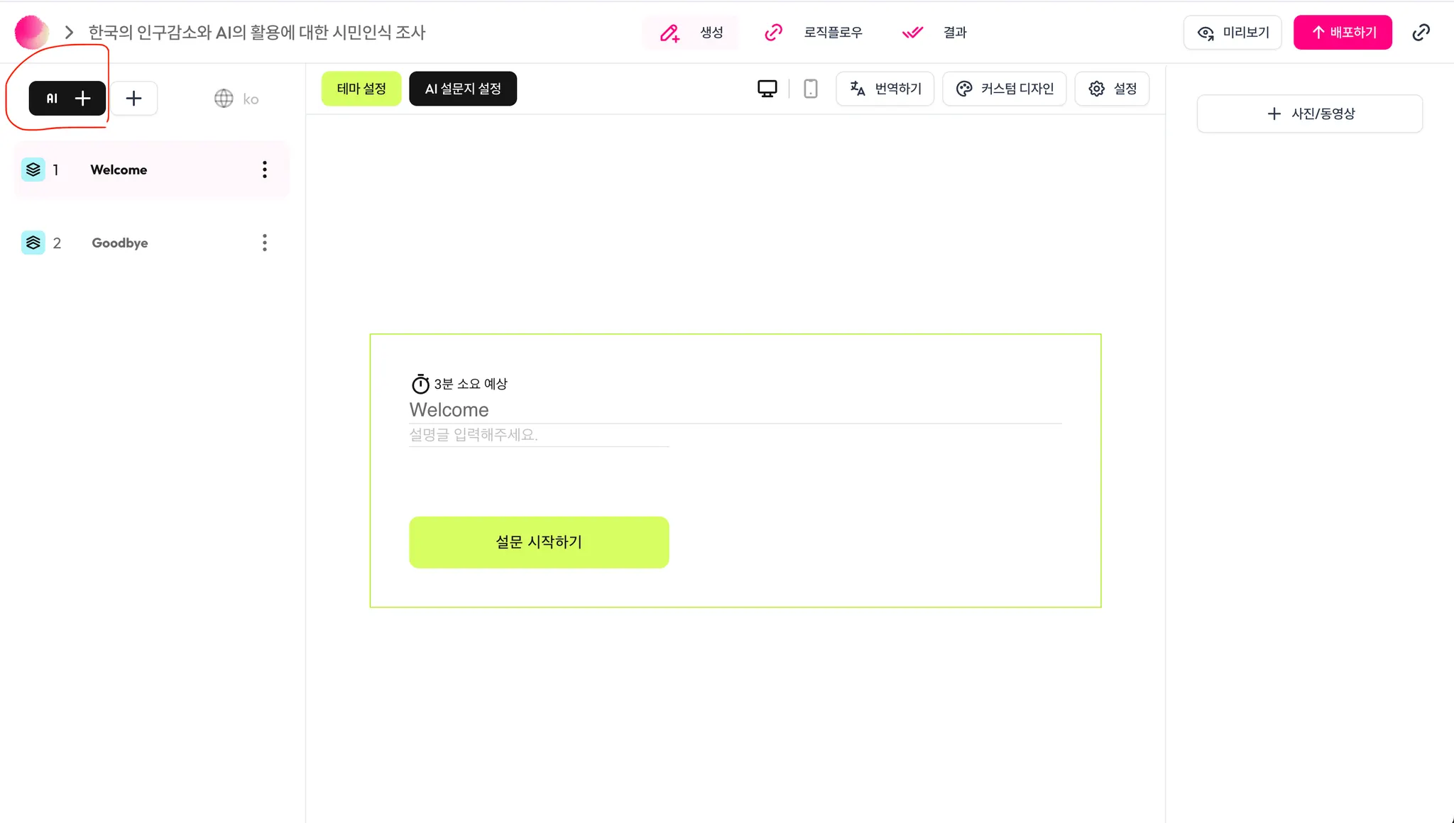 모두 변경했으면 우측 상단의 배포하기 버튼을 눌려야 설문이 생성되거나 변경한 것들이 업데이트 됩니다.