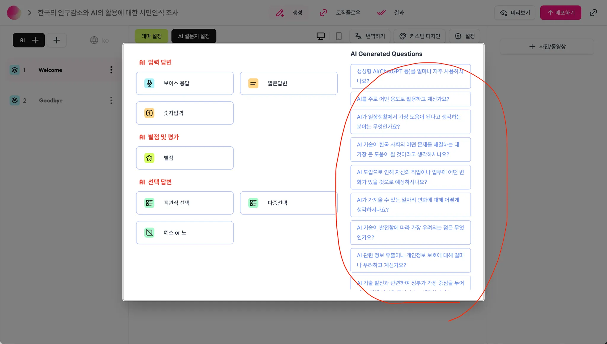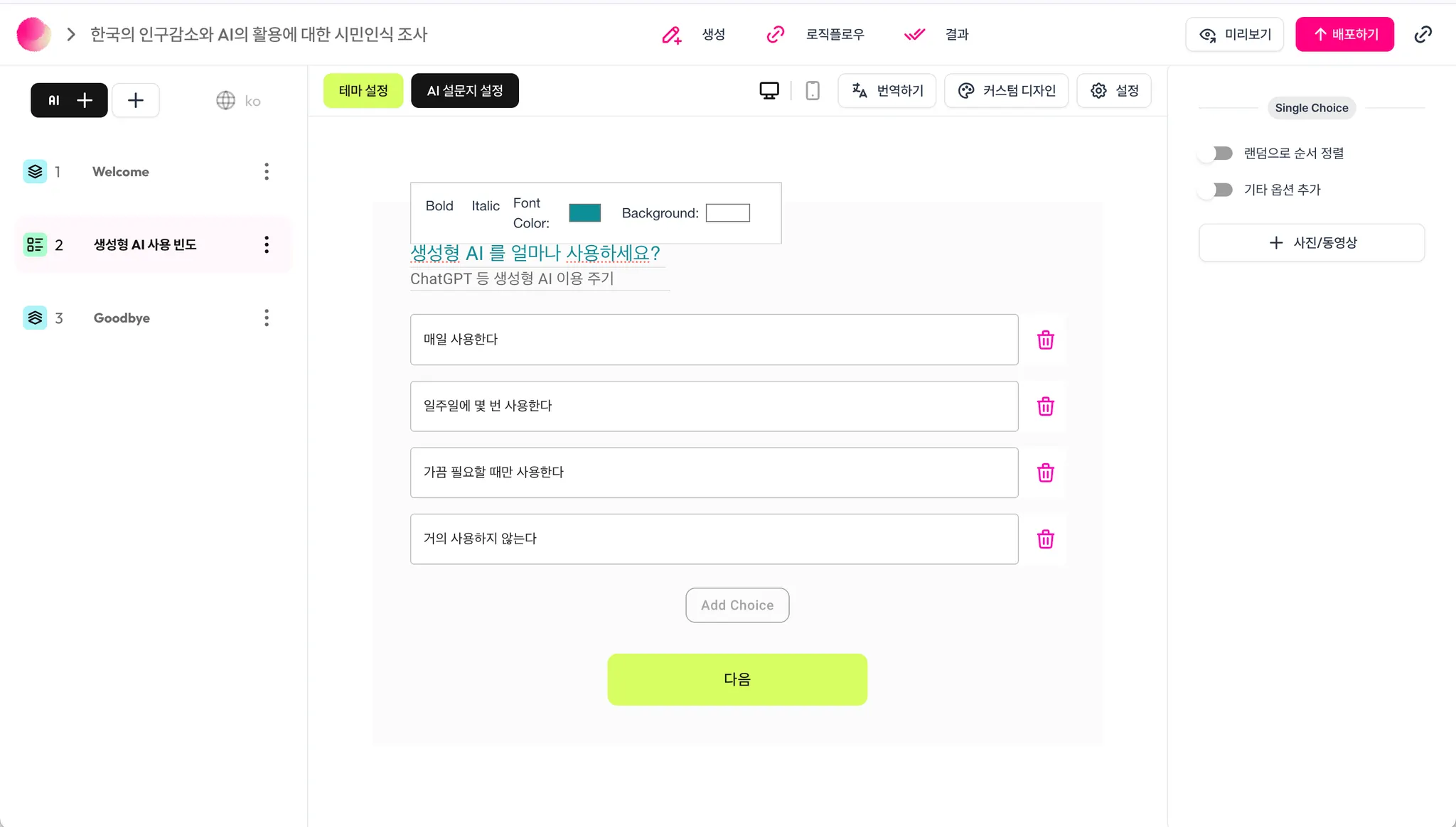 Generate Questions 버튼을 누르면 AI가 질문을 생성하는 시간이 조금 걸리기 때문에 기다려 주세요.(UX상 이 부분에 대한 안내와 로딩은 추가될 예정입니다.) 설문 리스트에 생성이 된 것이 보이면 선택해 들어가세요. 그러면 아래와 같은 세부설정 화면이 나옵니다.