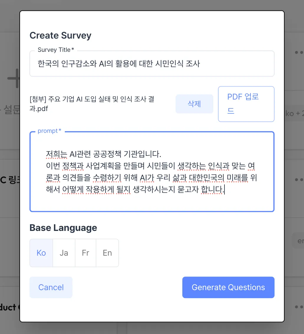 설문제목(외부에 보이지 않습니다. 편하게 알아보기 쉽게 정해주세요)을 입력하고, 질문생성에 도움이 되는 PDF를 업로드 해주세요. 그리고 Prompt란에는 질문생성의 방향성이 되는 내용을 써 줍니다. (언어는 설문 생성후 나중에 한꺼번에 자동번역이 가능합니다.)