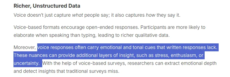 향후 설문 기술 트렌드로는: 음성 인터뷰, 감성 인식, 텍스트/음성/이미지 혼합 입력 등 다양한 방식의 대화형 설문이 언급됩니다. barmuda.in
