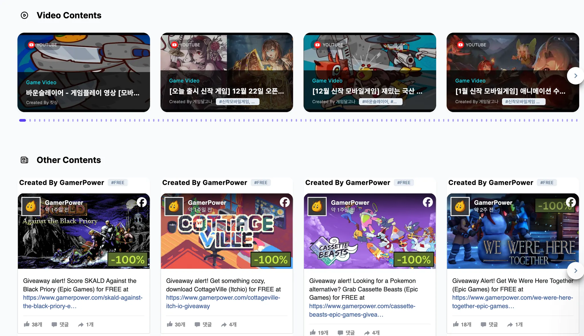 https://wame.is/ko/hot 페이지에서 Video Contents 및 Other Contents 항목을 위한 api 2개 추가 (기존에는 list 하나로 했었는데 list 대신 video-contents 및 other-contetns 각각 호출로 분리 및 페이징 기능 추가(백엔드 작업 미완료) juno처리완료